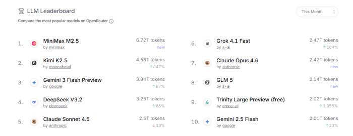 これは一時的な現象では決してない。記事出稿時点でも、OpenRouterの月間ランキングでは中国製モデルが依然として首位にあり、トップ5のうち3つを中国勢が占めている。MiniMax、Kimi、DeepSeekが、世界の開発者にとって優先的な選択肢となりつつある。