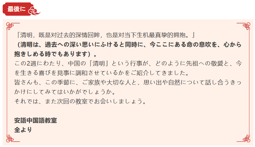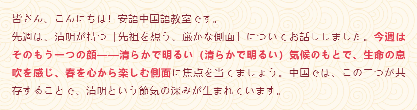 2026.03.31【安語中国語教室】季節の文化「清明——先祖を想い、春を迎える日」①