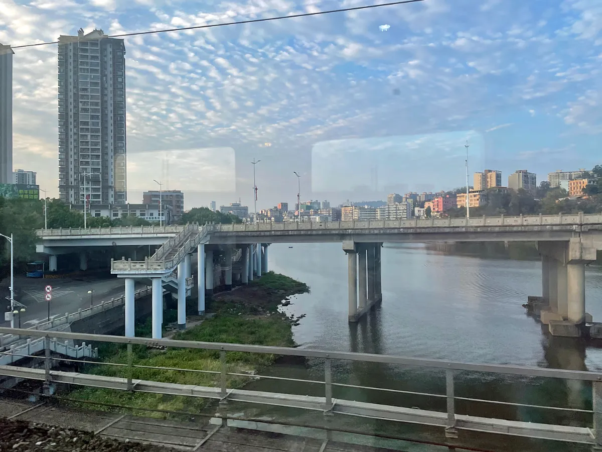 列車は花都、郭塘、江村、大朗を経て広州白雲へ向かう。かつて何もなかった白雲区だが、新駅開業とともに風景は一変し、都市間鉄道や高鉄が在来線と並走する区間が続く。