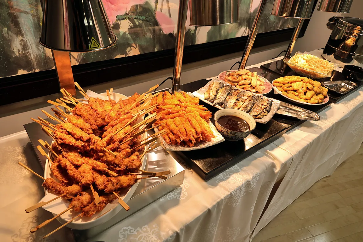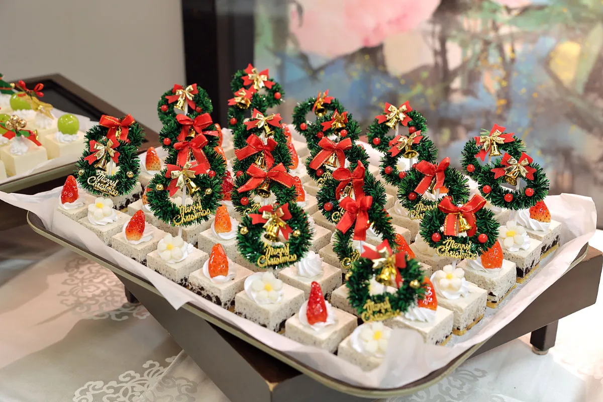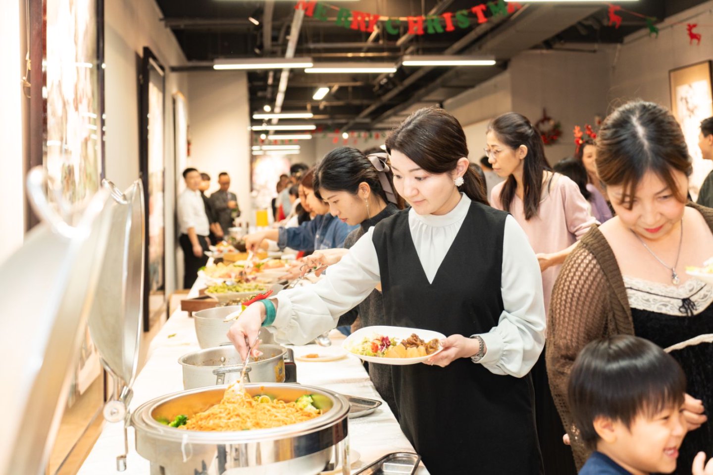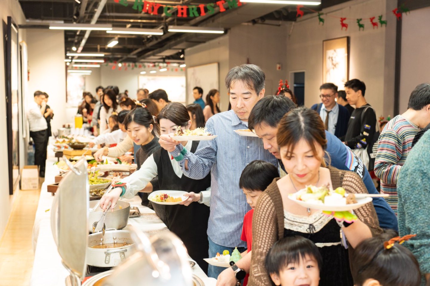 フードの陳列コーナーには、クリスマスイベントにぴったりの美味しい料理がずらりと並び、会場に入った瞬間から食欲をそそります。なかでも牛肉料理は大人気。ひと口頬張るたびに、参加者たちの胃袋をがっちりとつかんでいました。
