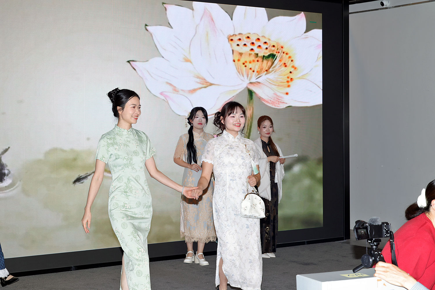 中国の伝統衣装・チャイナドレスを身にまとったスタッフによるファッションショーがスタート。2人1組で優雅にステージを歩く姿は、まさに圧巻。目が覚めるほどの華やかさに、参加者たちは思わず目を奪われていました。