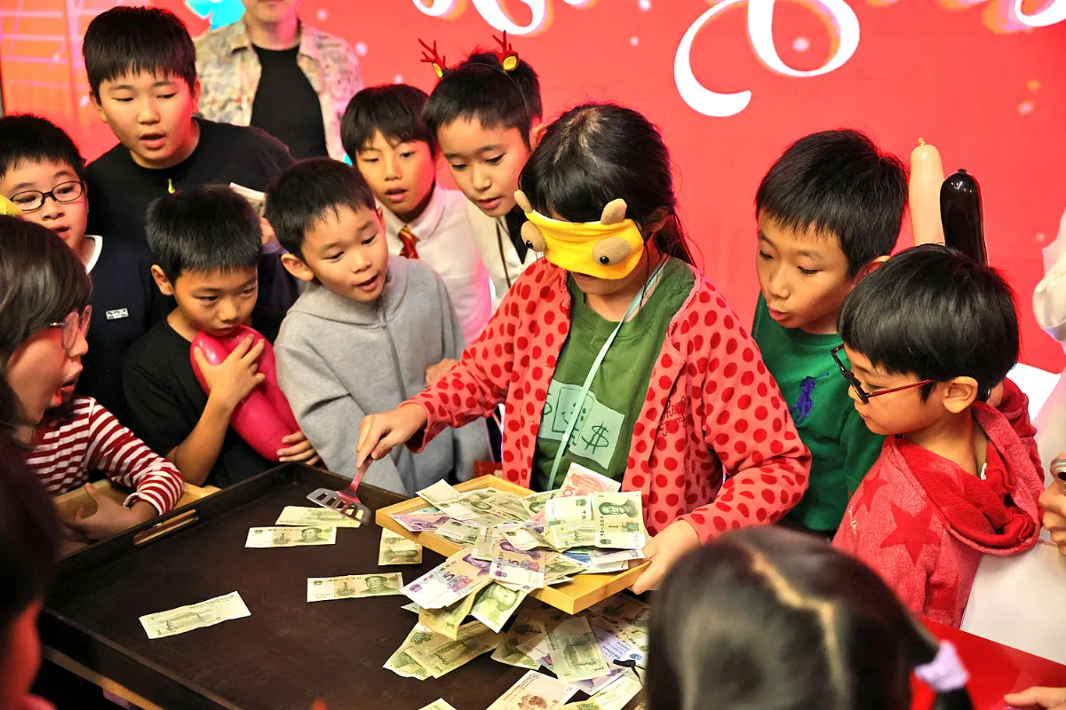 ちびっこたちに大人気のお金掬いゲーム。目隠しをしたまま、フライ返しとトレーを使ってテーブルの上の現金をすくいます。制限時間は30秒。掬った分はすべて持ち帰りOKという太っ腹ルールに、会場は大盛り上がり。100元札が入った瞬間には、「おおー!」という歓声が響き渡りました。