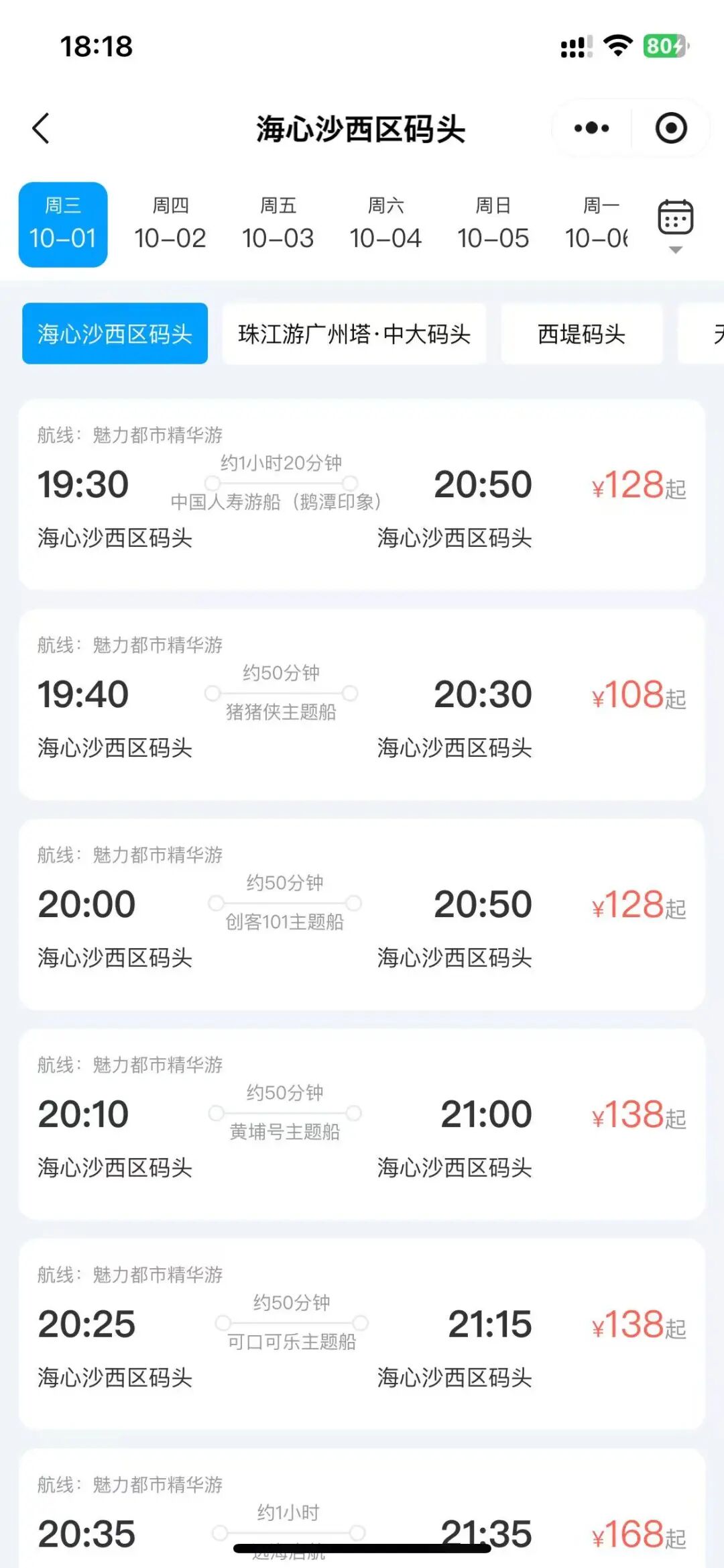④日付と「海心沙西区碼頭」「珠江游広州塔・中大碼頭」「西堤碼頭」「天字碼頭」「省総碼頭」「芸術中心碼頭」「海心沙東区碼頭」から選択