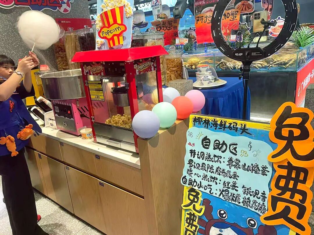 店頭には、並び待ちをするゲスト向けに無料のドリンクやポップコーン、綿あめといったサービスがある