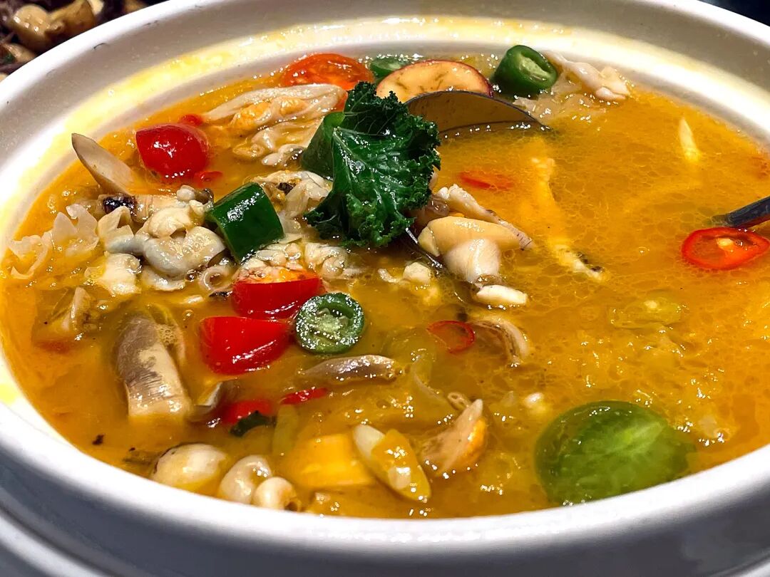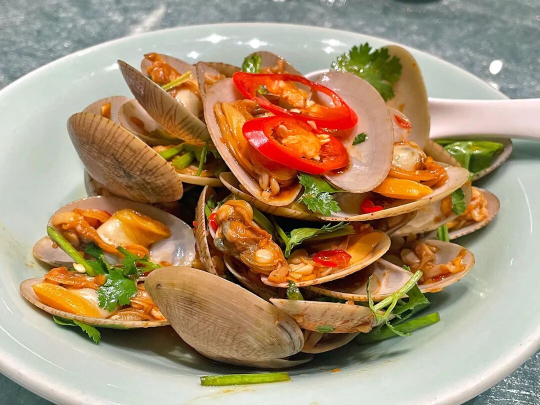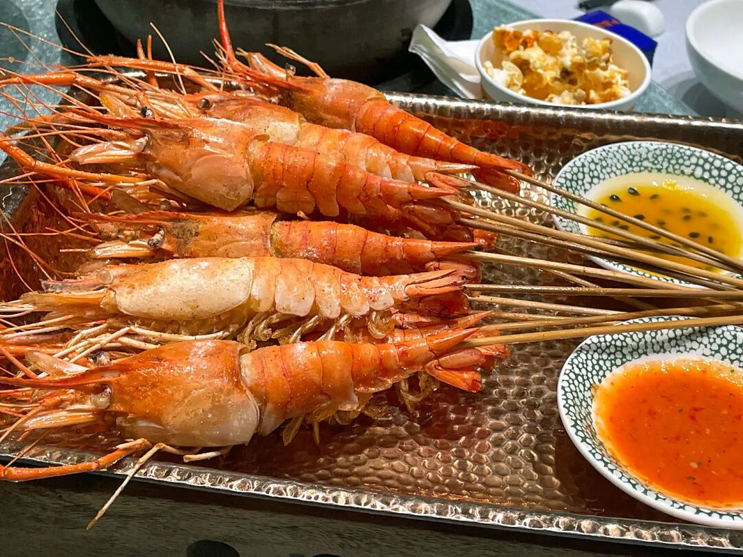 同店の看板はエビ料理で、川で獲れた淡水長腕エビ(ロシエビ)を串に挿し、強火で豪快に焼き上げる碼頭焼羅氏蝦(1皿109元)が特に有名だ。濃厚で香り高い味付けが特徴で、甘ダレやパッションフルーツタレをつけて食べるとエビ本来の旨味がいっそう際立つ。ただし、殻を剥くと身が思いのほか小さくなるため、そのギャップに驚かないようにしたい。