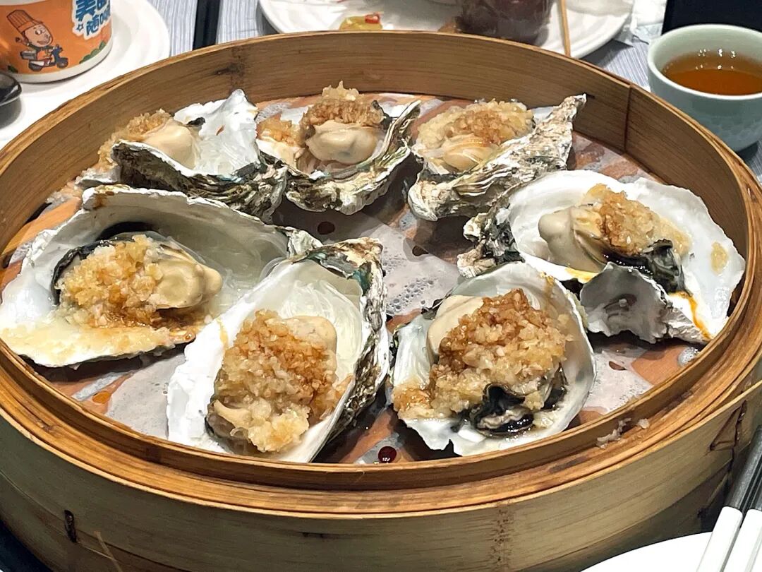 百香果蒸鮑魚(左)と蒸籠で蒸した嬾生蠣