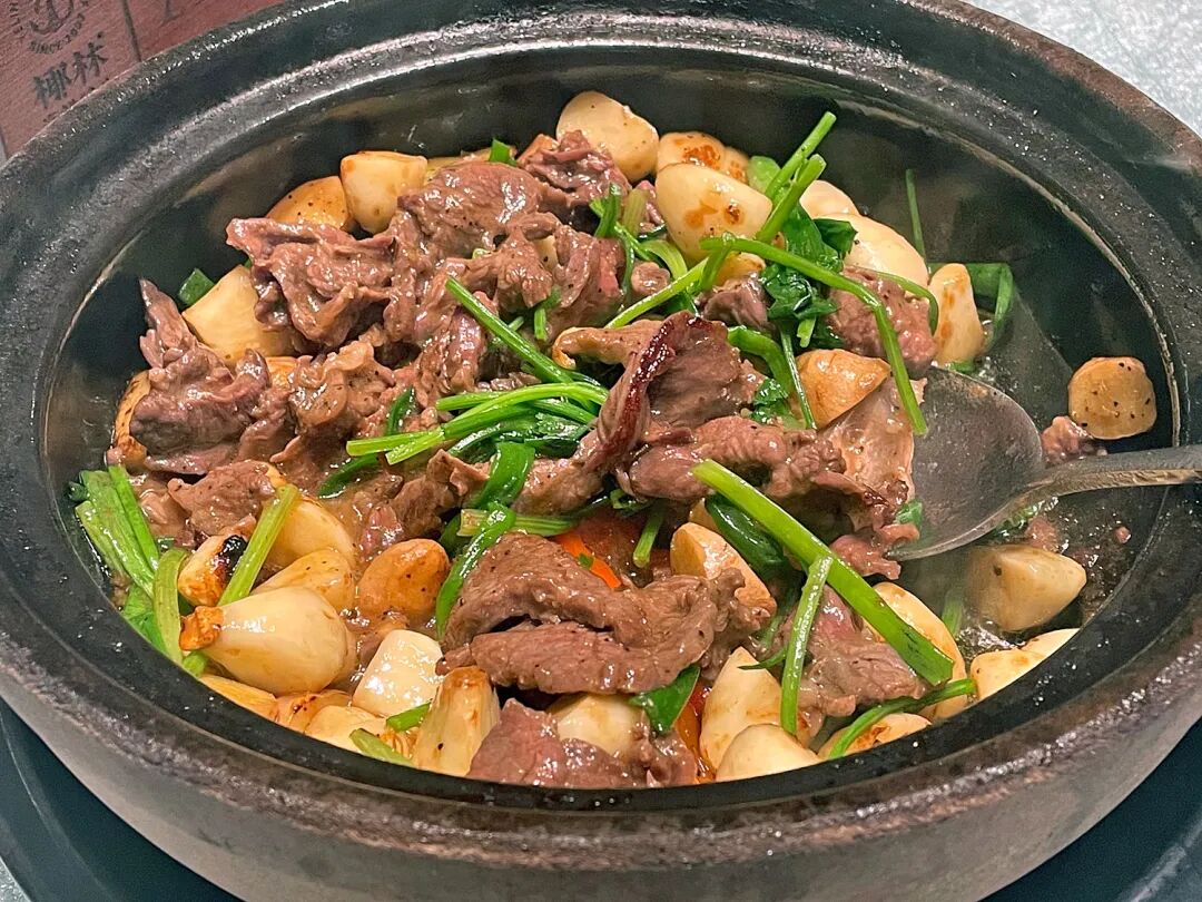 牛肉とニンニク、生姜を土鍋に入れてジェージェー(啫啫)と蒸し焼きにした啫啫牛肉(89元)