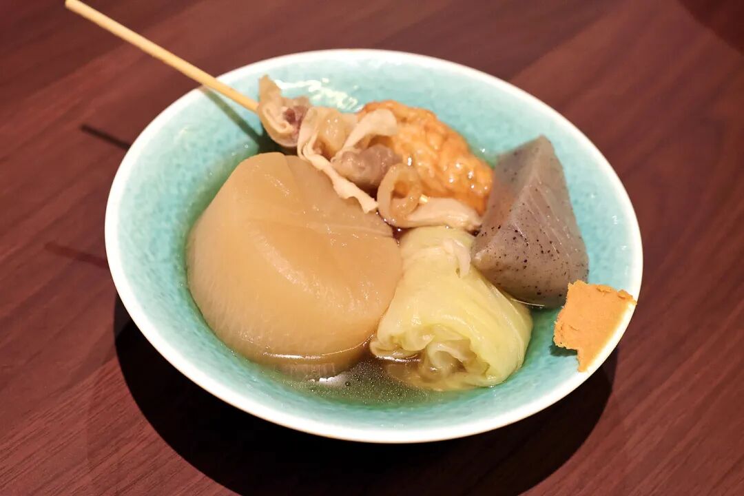 もう一つの看板といえば、料理長の手で丹念に仕込まれたおでん(各10元〜)。5個48元の盛り合わせ(種類はお店任意)は、しっかり染みた出汁の旨さがどれにも行き渡り、何を食べても思わず口元が緩むほどの出来栄えである。これから寒くなる時期には、ますます恋しくなる逸品だ。