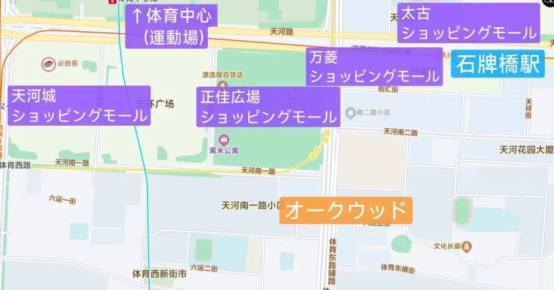 地下鉄3号線が通る「石牌橋駅」から徒歩約10分と交通至便な立地にあり、特に単身の日本人出張者や駐在者から高い人気を誇る「オークウッド」。周辺には大型ショッピングモールや日本料理店が豊富で、日本人学校のバスも徒歩圏内に停車。安心安全の警備体制も魅力です。